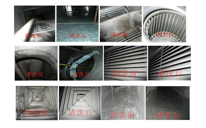 用專用清洗劑對百葉風口、格柵進行清洗,清洗過程中既要將污垢清洗干凈,又要防止其退色和變形,所以選用中性清洗劑(由非離子表面活性劑、滲透劑等組成)進行清洗。清洗后進行消毒處理。