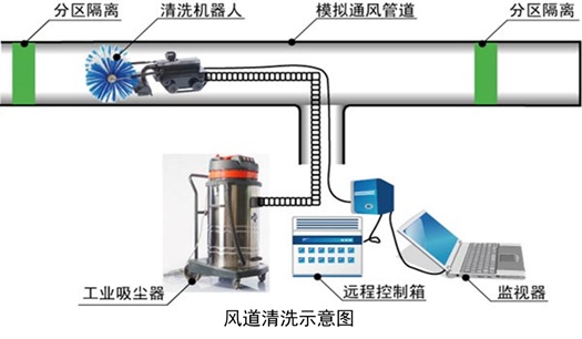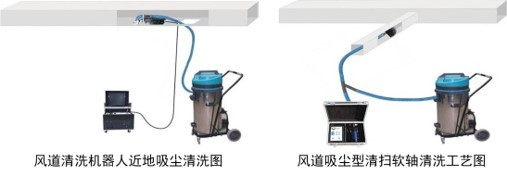 (3)在狹小的風道內,清掃機器人體積過大進不去,就要使用吸塵型軟軸做清掃揚塵,并同時進行吸塵處理(清掃支風道)。