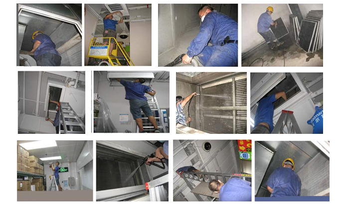 長沙某大型超市中央空調公共區域采用“水冷機組+空氣處理機”的全空氣處理系統,共有空氣處理機19臺,局部區域如員工辦公室、檔案室等采用風機盤管,共有風機盤管26臺。中央空調投入使用已3年多,甲方委托我司對風系統進行清洗保養服務,此次共清洗空氣處理機19臺、風機盤管26臺,清洗風管約7500平米(展開面積),清洗空調風口300多個。以下為清洗實施方案: