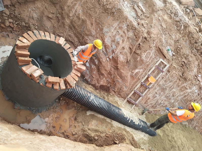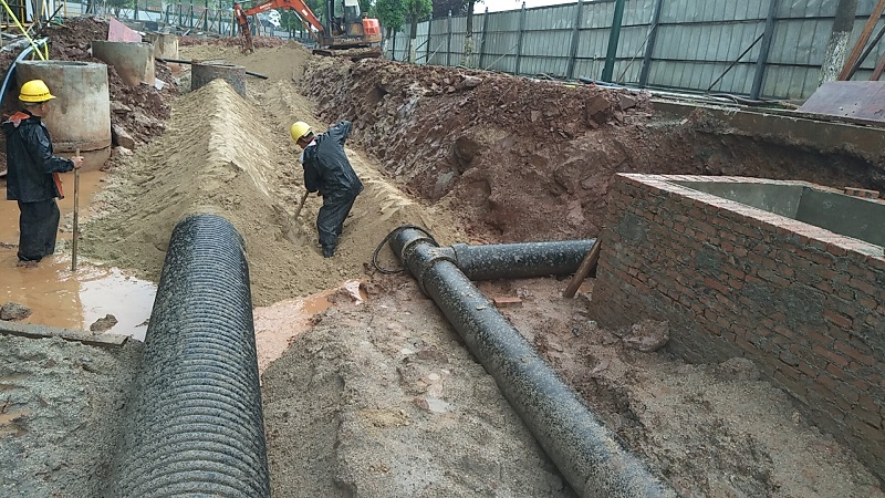 公司承接了百聯(lián)購物公園的小市政項目,項目主要由DN300球墨鑄鐵給水管道、DN600HDPE雙壁波紋雨水管道、DN400雙壁波紋污水管道、DN100PE中水管道及各種閥門井及檢查井組成,管道設(shè)計結(jié)構(gòu)錯綜復(fù)雜、排列緊密,污水管道設(shè)計埋深甚至達(dá)到4~5米,整個項目又均為風(fēng)化巖地貌,施工難度很大。加之工期正值端午前后,雨水充沛,大量暴雨也為施工帶來了不小的難度。施工期間,先后遇到了如管道作業(yè)面狹小四排管道施工無法同時推進(jìn)、井面設(shè)計標(biāo)高與園林地面標(biāo)高無法統(tǒng)一、深基坑土方開挖及支護(hù)、甲方開業(yè)搶進(jìn)度等一系列問題。但是,在我們星澤公司項目部全體同仁的共同努力下,以發(fā)揚(yáng)不怕苦、不怕累的艱苦奮斗的精神,本著客戶第一、質(zhì)量第一的理念,在保證安全和工期的前期下,順利完成施工任務(wù),項目也得到了業(yè)主及總包的充分肯定。