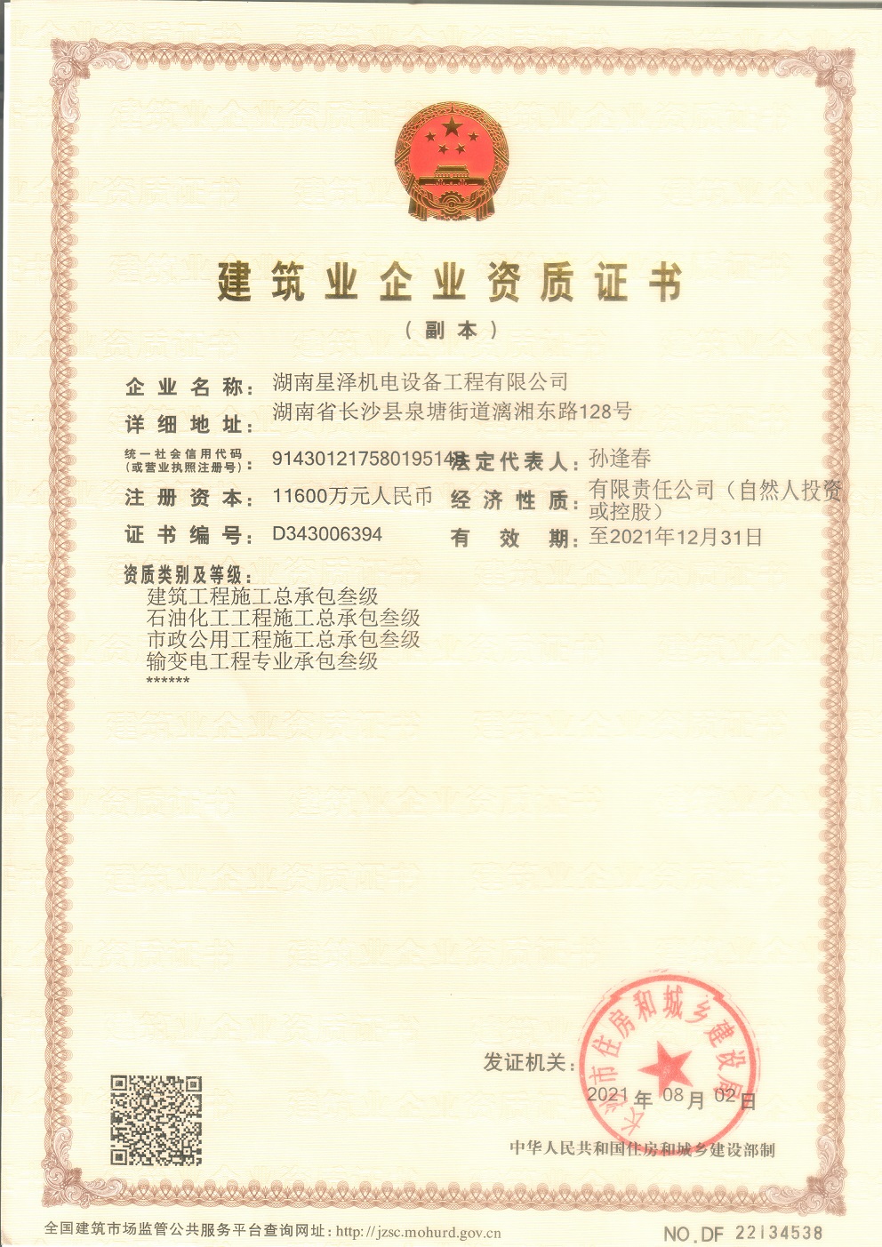 近日,公司獲得由長沙市住建局頒發的市政公用工程施工總承包叁級和石油化工工程施工總承包叁級兩項總承包資質。至此,公司現已擁有七項建筑業資質和兩項特種資質以及一項電力資質,它們分別是:機電施工總承包貳級、建筑機電安裝專業承包壹級、消防設施工程專業承包壹級、建筑工程施工總承包叁級、市政公用工程施工總承包叁級、石油化工工程施工總承包叁級、輸變電工程專業承包叁級、壓力容器、壓力管道(GC2)兩項特種資質以及承裝(修、試)電力設施許可證資質。