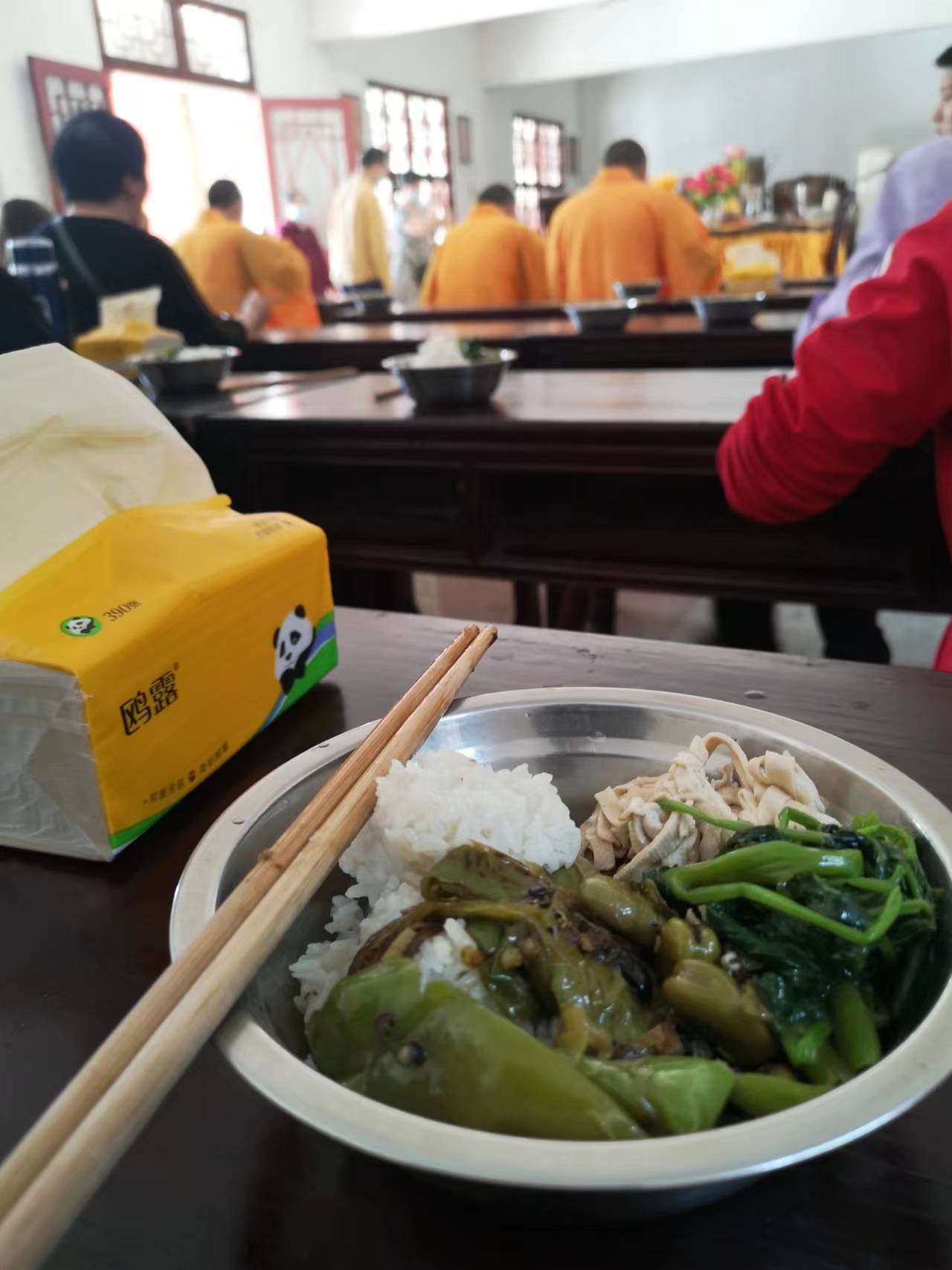 已到正午時分,僧人和修持者早課正好完畢。人總是要常懷善念和慈悲之心,功德箱里去盡份心意,有侍者見到,忙作揖謝過,并沒有見我行跪拜菩薩,就覺得有點怪,但她也不知道我信仰的。看到中午僧飯開始,我入得堂內想看過究竟,僧人們又正在唱誦經文,猜想可能是什么神農五谷經之類,應該是感恩大地所賜五谷,讓眾生得以生存。大住持還用筷子和湯匙,挑上幾粒米飯,在眾僧們的唱誦下送出門外,轉回來時不見飯粒,想必是他們感恩回饋,或許,是照顧其他眾生,如貓狗老鼠螻蟻之類生靈,給予它們一些生存的食物,看來,此舉就可以說證得“眾生平等,普渡眾生”佛法,看來菩薩邊鬼也喜歡的。為了體驗廟堂齋飯,我便使出孫行者頭銜向負責飯堂的管理乞討一頓齋飯,她看我一個人并就答應了,安排好飯桌,像眾僧們一樣等待施飯,這里吃飯的主要是僧人,另外就是習佛修行的信眾和居士,大家都安靜的坐著,好像小學生等老師來上課。在施飯者挨個進行時,看到僧人們個個雙手合十,點頭謝過,此情此景讓人好生感動。每施到我,一股油然而生的感恩之情溢于言表,不禁也雙手合十,點頭感恩。雖是齋飯,但色香味美不失家常,只是不葷罷了,菜品和味道讓我來了一次光盤行動,對鋤禾之辛苦體會更深了,因不勞而獲的幸運讓我動容。