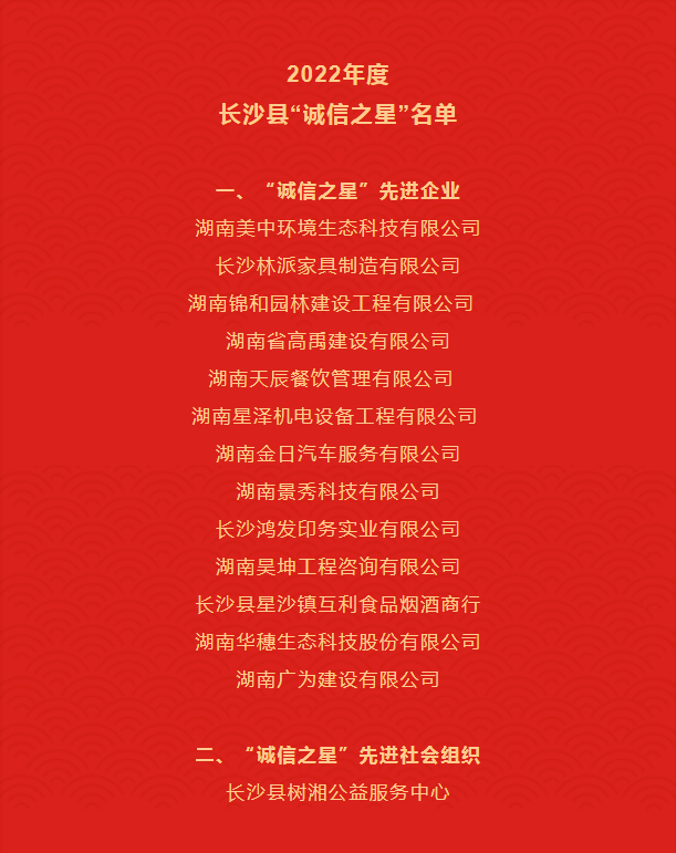 12月1日,長沙縣2022年“誠信之星”名單正式公布。經長沙縣社會信用體系建設領導小組辦公室批準,授予湖南錦和園林建設工程有限公司等13家單位“誠信之星”先進企業稱號,授予長沙縣樹湘公益服務中心“誠信之星”先進社會組織稱號,授予黃明海等9名同志“誠信之星”先進個人稱號。